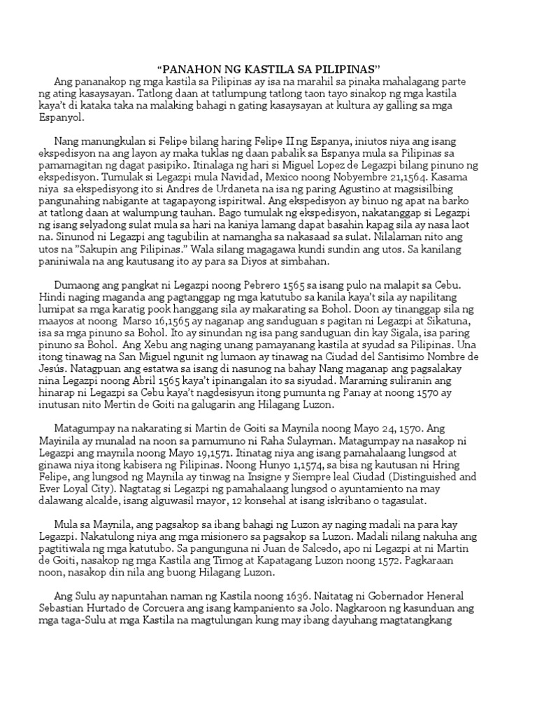 Isaalang-alang ang sumusunod na mga tanong bilang patnubay sa talakayang gagawin. Nagtagal nang tatlong mga taon ang pananakop o okupasyon ng mga Hapones sa Pilipinas. 10Itinalaga nya si Martin de Goiti bilang pinuno ng puwersang Espanyol sa Maynila.